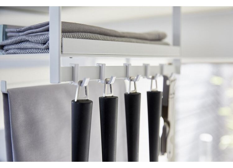 可動式フック5個は良く使うキッチン小物の収納に。