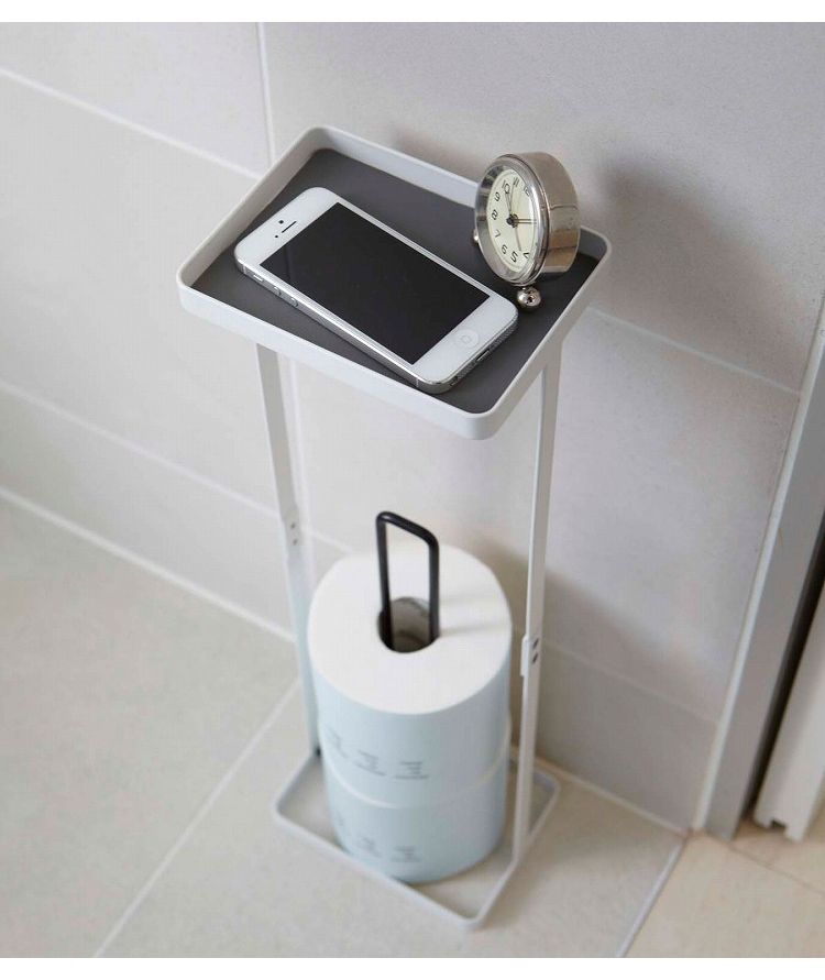 携帯電話などが置けるトレイが付いたトイレットペーパースタンド!コンパクトな設計なので、トイレに設置しても邪魔になりません。トイレットペーパーは最大3個収納できます。