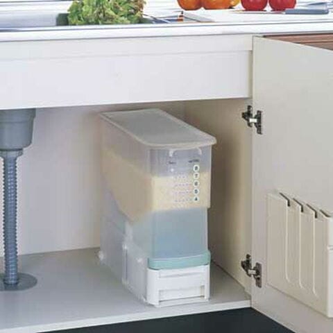 材質:本体・フタ/PP、計量引き出し・ガイド・米受けトレー・底板/PS、切り替え部品/PE、すべり止め/合成ゴム