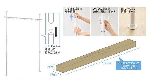 ワンタッチでつっぱりができるので取り付けやすく、横ポールを取り付けるフックの高さは自由に調節できます。