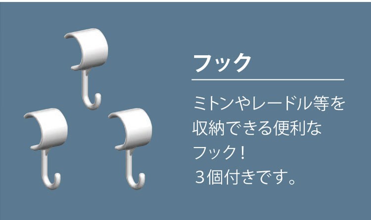 フック:ミトンやレードル等を掛けて収納できる便利なフック。3個付きです。