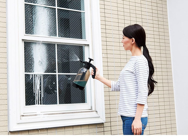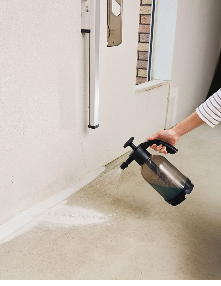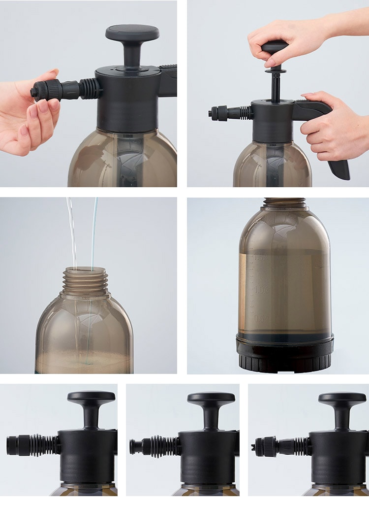 1.ボトルに水と液体洗剤を入れる。(水用ノズルを使用の際は、水のみを入れる。)