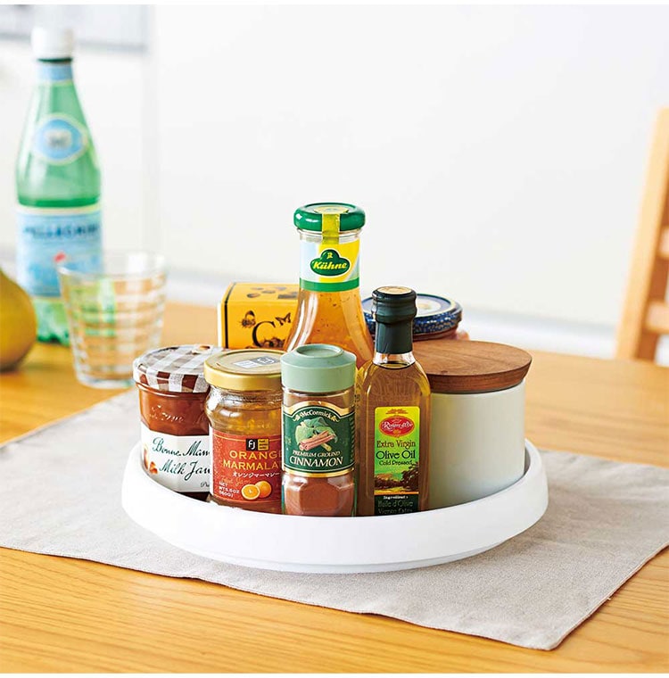 冷蔵庫だけでなく、シンク下の収納やダイニングテーブル上の調味料置きにも。