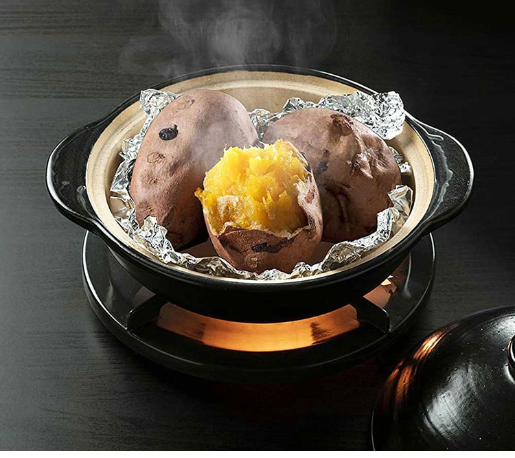 本体、蓋内面は素焼きなので、食材から出る水分をほどよく吸収し美味しい焼き芋が作れる。