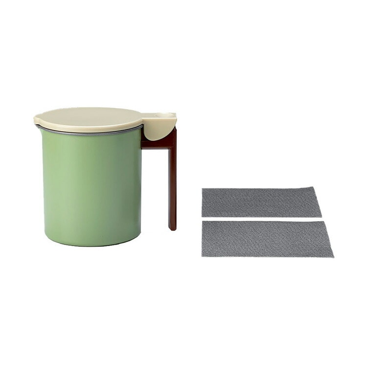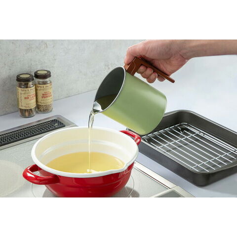 本体/鉄、表面加工/フッ素樹脂塗膜加工、取手/メラミン樹脂、ふた/66ナイロングラスファイバー、こしアミ/ステンレス、シート固定リング/ステンレス、活性炭油ろ過シートW12cm/パルプ・レーヨン・粉末活性炭・ケイ酸マグネシウム