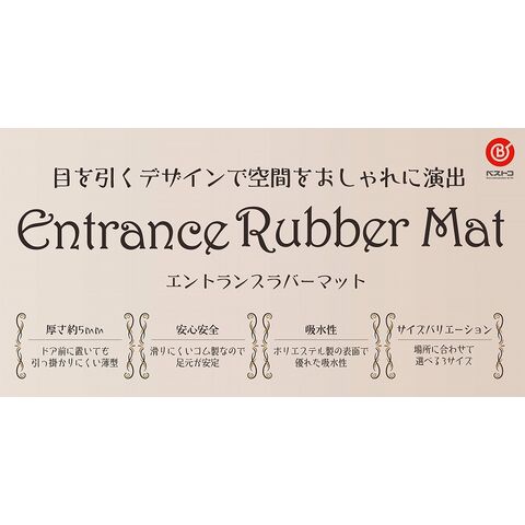 デザイン性が高くエントランスをおしゃれに演出する玄関マットシリーズ目を引くデザインだから置くだけで玄関などをおしゃれに演出します。表面のポリエステルが雨水をしっかり吸水、雨の日でも靴裏の水気と汚れをしっかり除去します。裏面はゴム製だから雨で濡れても滑りにくく安心安全。マットの厚さが約5mmの薄型タイプなのでドアの前に置いても引っ掛かりにくい。玄関の内と外どちらでもお使いいただけます。家族世帯の玄関に最適な40×60cmサイズ。