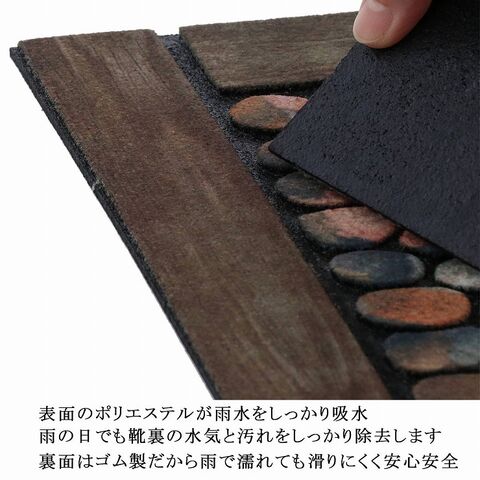 デザイン性が高くエントランスをおしゃれに演出する玄関マットシリーズ目を引くデザインだから置くだけで玄関などをおしゃれに演出します。表面のポリエステルが雨水をしっかり吸水、雨の日でも靴裏の水気と汚れをしっかり除去します。裏面はゴム製だから雨で濡れても滑りにくく安心安全。マットの厚さが約5mmの薄型タイプなのでドアの前に置いても引っ掛かりにくい。玄関の内と外どちらでもお使いいただけます。家族世帯の玄関に最適な40×60cmサイズ。