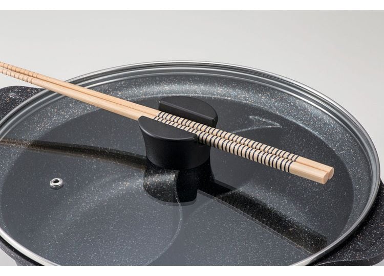 二食鍋、仕切り、仕切り付き、仕切り鍋、IH、ガラス蓋、ガラス、ふた付き、オール熱源、ガス、鍋、黒、ブラック、おしゃれ、28cm、大きい、大、卓上、二人用、5L、こげつかない、お手入れ簡単、洗いやすい