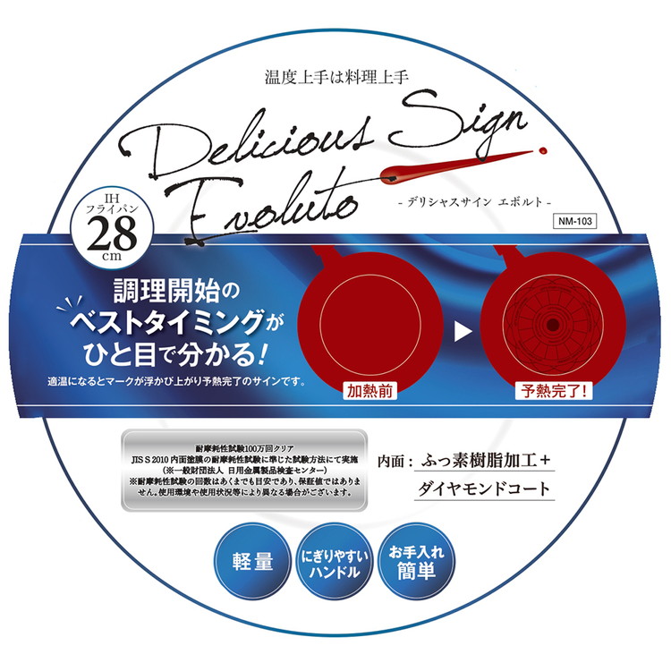 調理開始のベストタイミングがひと目で分かるIH対応フライパン。予熱が完了すると内面に浮かびあがってくるマークが料理をおいしくできるサイン。食材を入れるタイミングを教えてくれるため、料理初心者にもわかりやすいです。重さを軽減!さらに軽くなったことでより使いやすくなりました。内面はふっ素樹脂加工+ダイヤモンドコートで、傷に強く、こびりつきにくい。耐摩耗性試験100万回クリア。(JIS S 2010 内面塗装の耐摩耗性試験に準じた試験方法にて実施)ハンドルは握りやすく滑りにくいシリコーン塗装がされています。