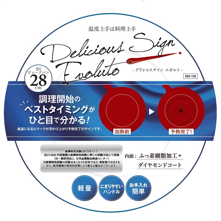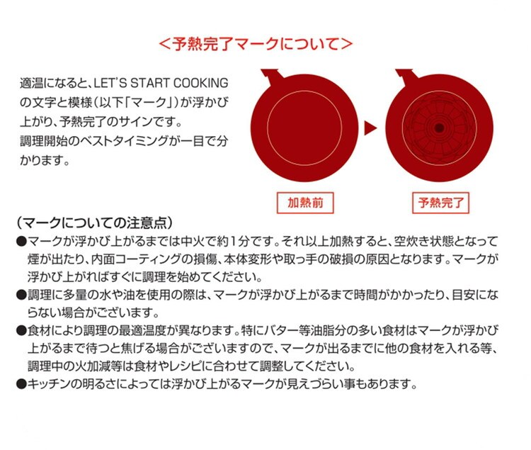 調理開始のベストタイミングがひと目で分かるIH対応フライパン。予熱が完了すると内面に浮かびあがってくるマークが料理をおいしくできるサイン。食材を入れるタイミングを教えてくれるため、料理初心者にもわかりやすいです。重さを軽減!さらに軽くなったことでより使いやすくなりました。内面はふっ素樹脂加工+ダイヤモンドコートで、傷に強く、こびりつきにくい。耐摩耗性試験100万回クリア。(JIS S 2010 内面塗装の耐摩耗性試験に準じた試験方法にて実施)角の丸い金属ヘラの使用OK。ハンドルは握りやすく滑りにくいシリコーン塗装がされています。