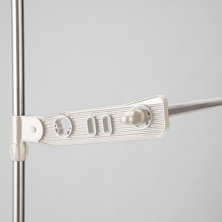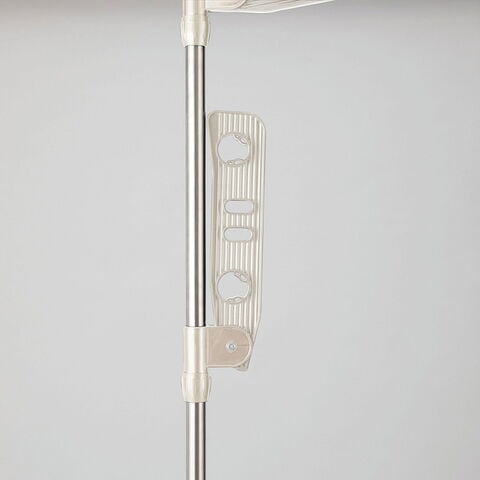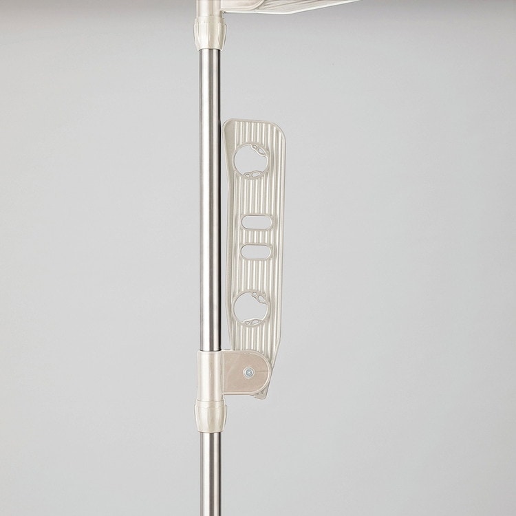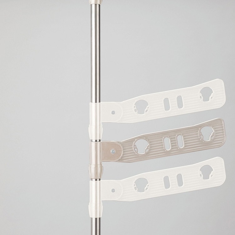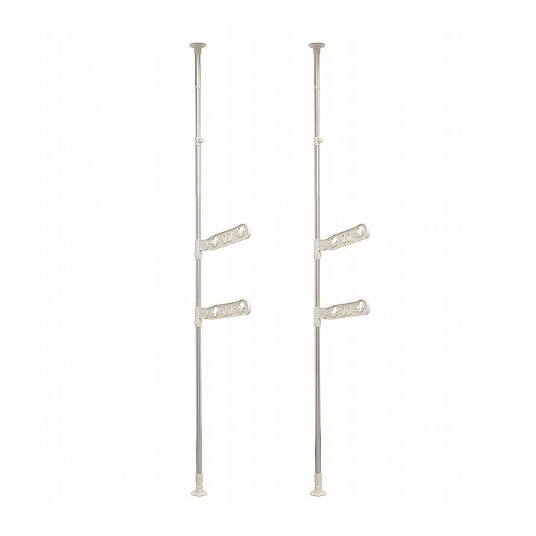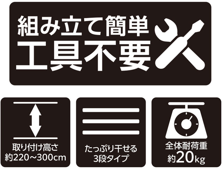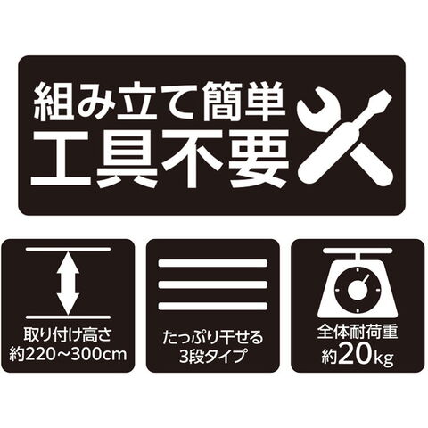 ライトグレーカラー物干しシリーズ内蔵バネ+ジャッキ方式でしっかりと固定できます。竿受けの高さは約10~190cmまで調整出来ます。竿しっかりと固定するので竿が落ちにくい。たっぷり干せる3段タイプ。取り付け高さ220~300cm。組み立て時工具不要。