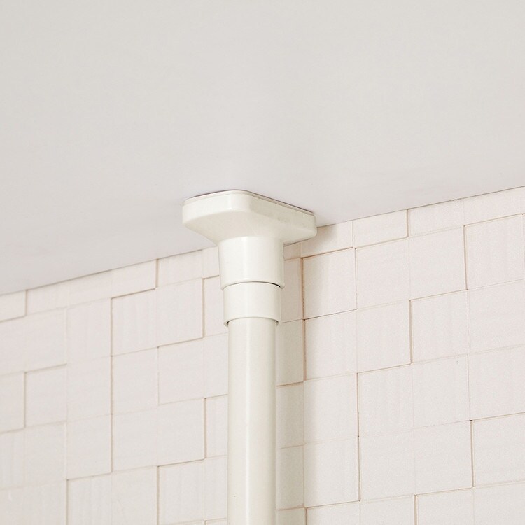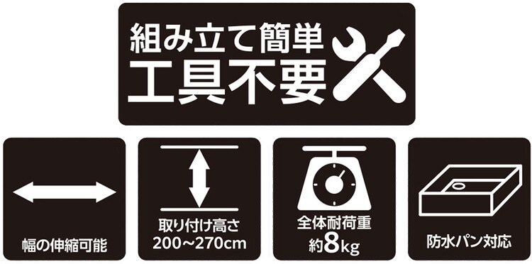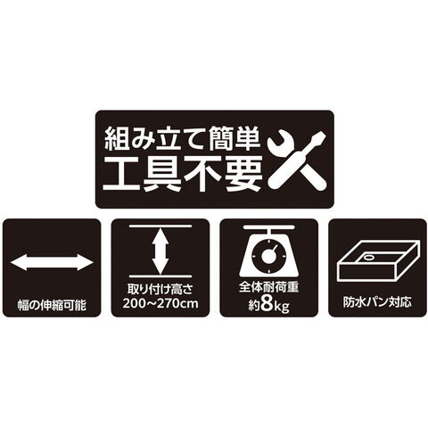 防水パン対応で取り付け方法も簡単。小物収納に便利でフックもかけられるフラット棚。防水パンにも床にも使用可能。(防水パン対応パーツ付き。)横幅の伸縮可能。内蔵ばね&ジャッキ方式でしっかり固定。