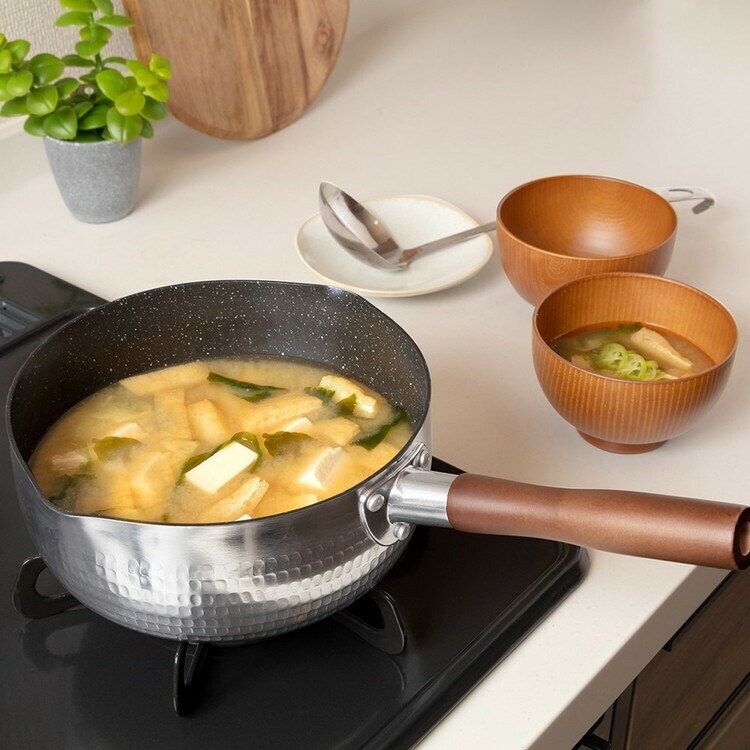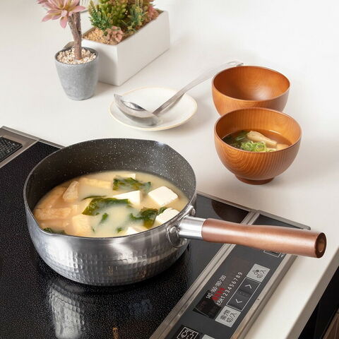 ■材質本体/アルミニウム合金、内面/ふっ素樹脂塗膜加工(ダイキンEK 耐摩耗性試験50万回クリア)、はり底/ステンレス鋼(クロム16%)、ハンドル/天然木