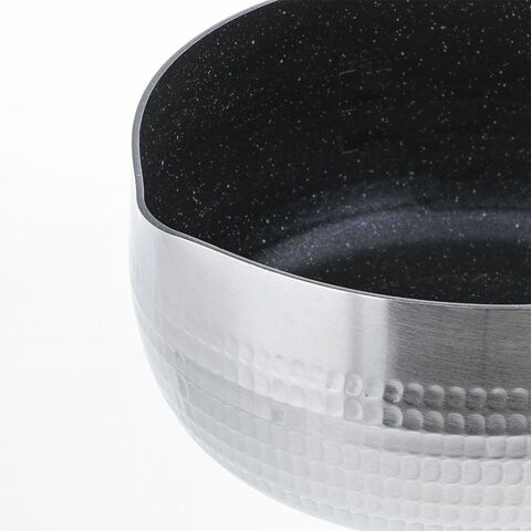 内面フッ素樹脂加工で傷に強くこびりつきにくい雪平鍋。内面ふっ素樹脂塗膜加工はダイキンEK(耐摩耗性試験50万回クリア)を使用。傷に強く汚れがこびりつきにくい。 角の丸い金属ヘラOK。内面には便利な分量目盛り付。汁物を注ぐときに便利な両側注ぎ口付。アルミ槌目加工で優れた強度。