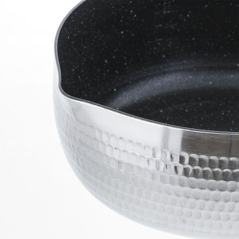 内面フッ素樹脂加工で傷に強くこびりつきにくい雪平鍋。内面ふっ素樹脂塗膜加工はダイキンEK(耐摩耗性試験50万回クリア)を使用。傷に強く汚れがこびりつきにくい。 角の丸い金属ヘラOK。内面には便利な分量目盛り付。汁物を注ぐときに便利な両側注ぎ口付。アルミ槌目加工で優れた強度。