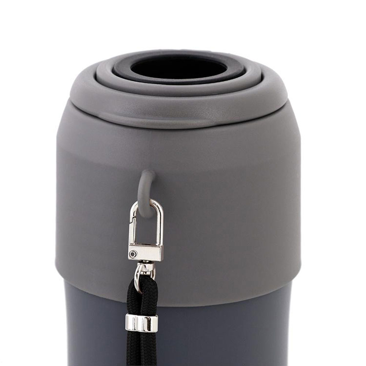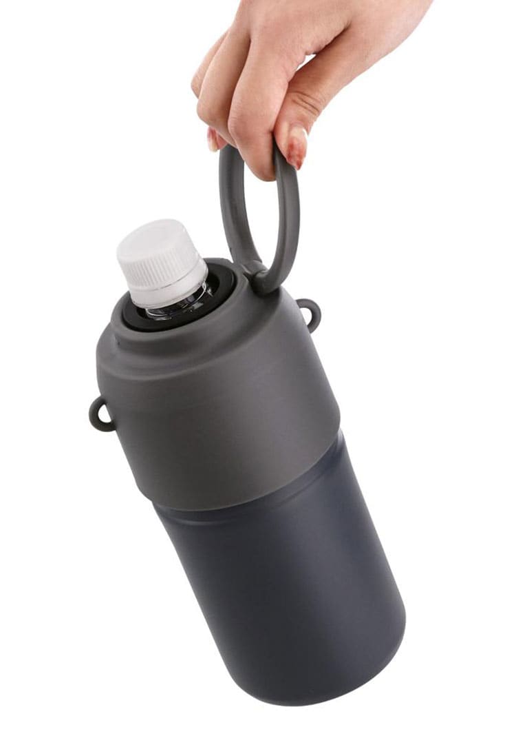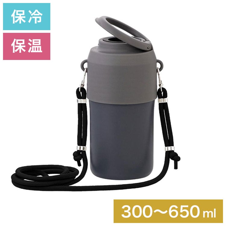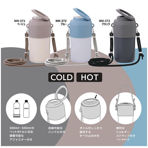 長さ調整できるショルダーストラップ付きで持ち運びに便利。保冷・保温効果のある真空二重構造。高さ調整できるアジャスター付きで容量は300ml~650mlまで対応!ハンドル付きで持ち運びしやすい。ショルダーストラップ付きで外出時にも水分補給しやすい。カバーの上部はシリコーンゴムなため、ペットボトル開閉時の滑り止めに!