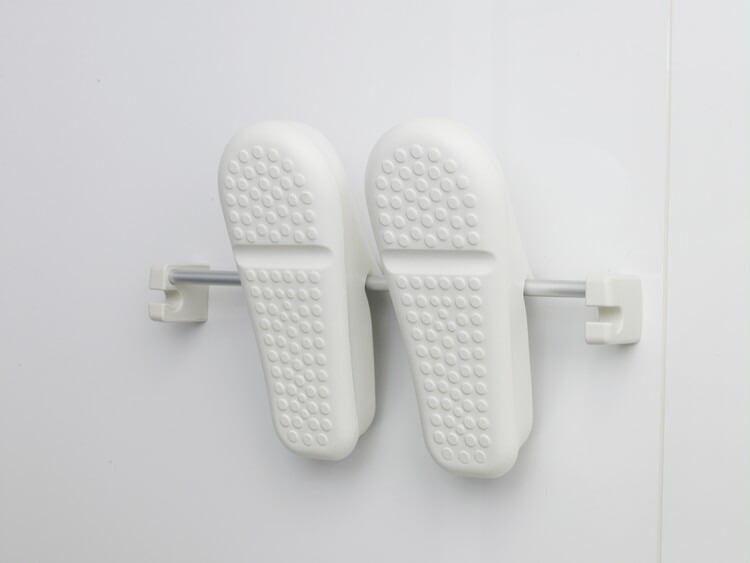 多様な収納性/バーにかける フック穴でつり下げる かかとにフラット面があり立たせやすい。