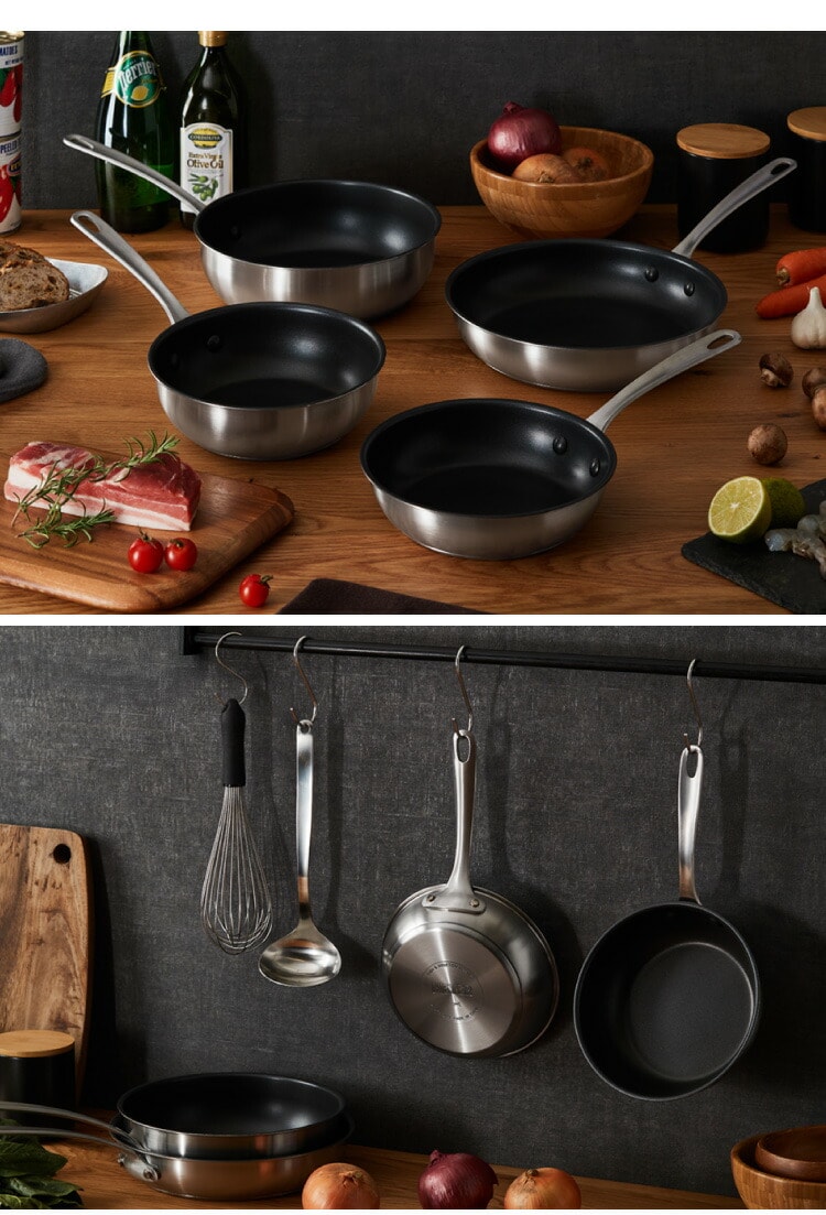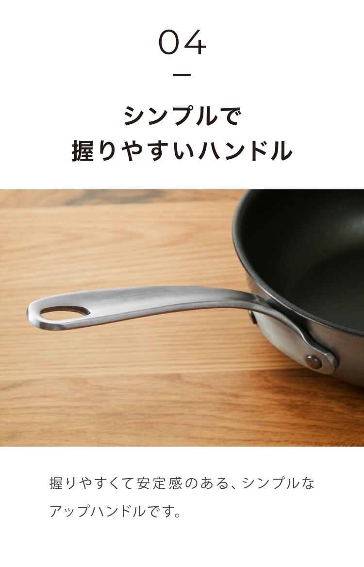 キッチンに出しっぱなしでもインテリアとして成立する、ステンレスのシルバーがシンプルでスタイリッシュなデザインのフライパン。