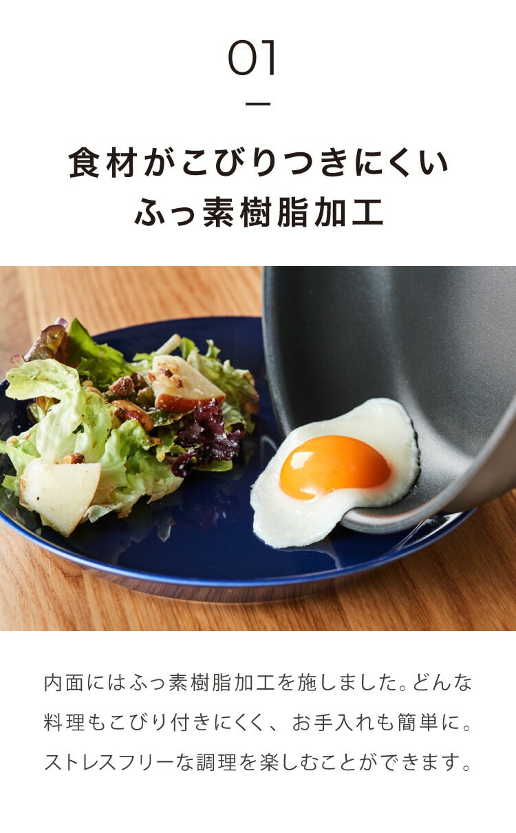 内面ふっ素樹脂加工を施し、どんな料理もこびりつきにくくお手入れ簡単。