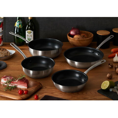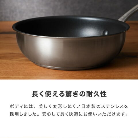 キッチンに出しっぱなしでもインテリアとして成立する、ステンレスのシルバーがシンプルでスタイリッシュなデザインのフライパン。