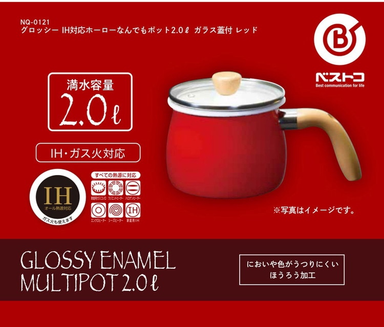 ベストコ 鍋 マルチポット 2.0L IH オール熱源対応 ホーロー ガラス蓋付 レッド NQ-0121 グロッシー【送料無料】