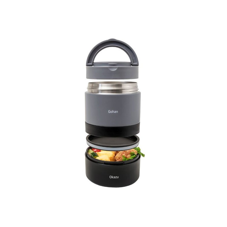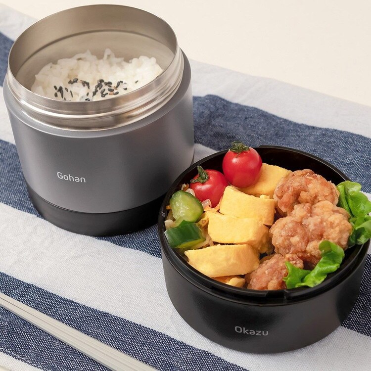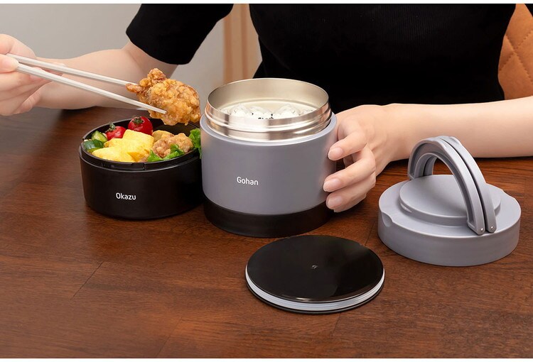 持ち運びやすいハンドル付きの保温弁当箱。ごはん容器とおかず容器が連結するお弁当箱です。持ち運びやすいハンドル付きで大容量なのにコンパクト。大容量なのにコンパクトであるため、通勤・通学でリュックや鞄を使用する際にかさばらずに持ち運びができます。ごはん容器は真空二重構造で、ごはん容器・おかず容器はパッキンが付いています。700mlはお茶碗約2.0杯、850mlは約2.7杯のご飯が入ります。おかず容器は両サイズ300ml入ります。