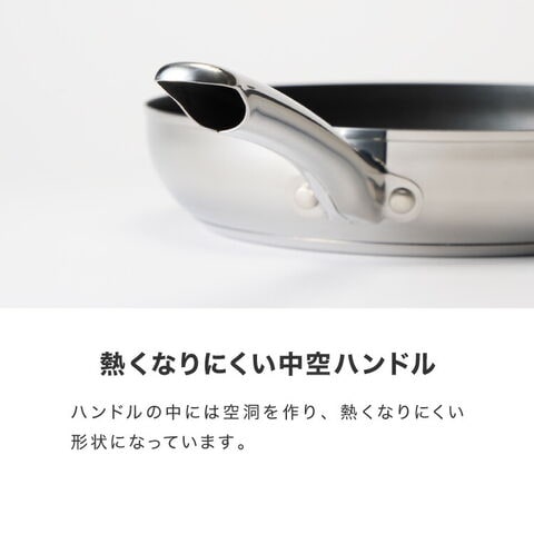 焦げ付きにくいノンステイック加工と熱くなりにくい中空ハンドル。