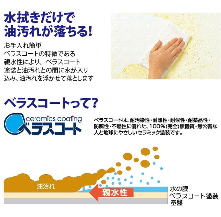 ベラスコート(親水性セラミック塗装)が表面と油汚れの間に入り込み油を浮かせて落とします。