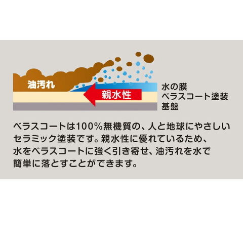 親水性に優れているため、水をベラスコートに強く引き寄せ、油汚れを水で簡単に落とすことができます。
