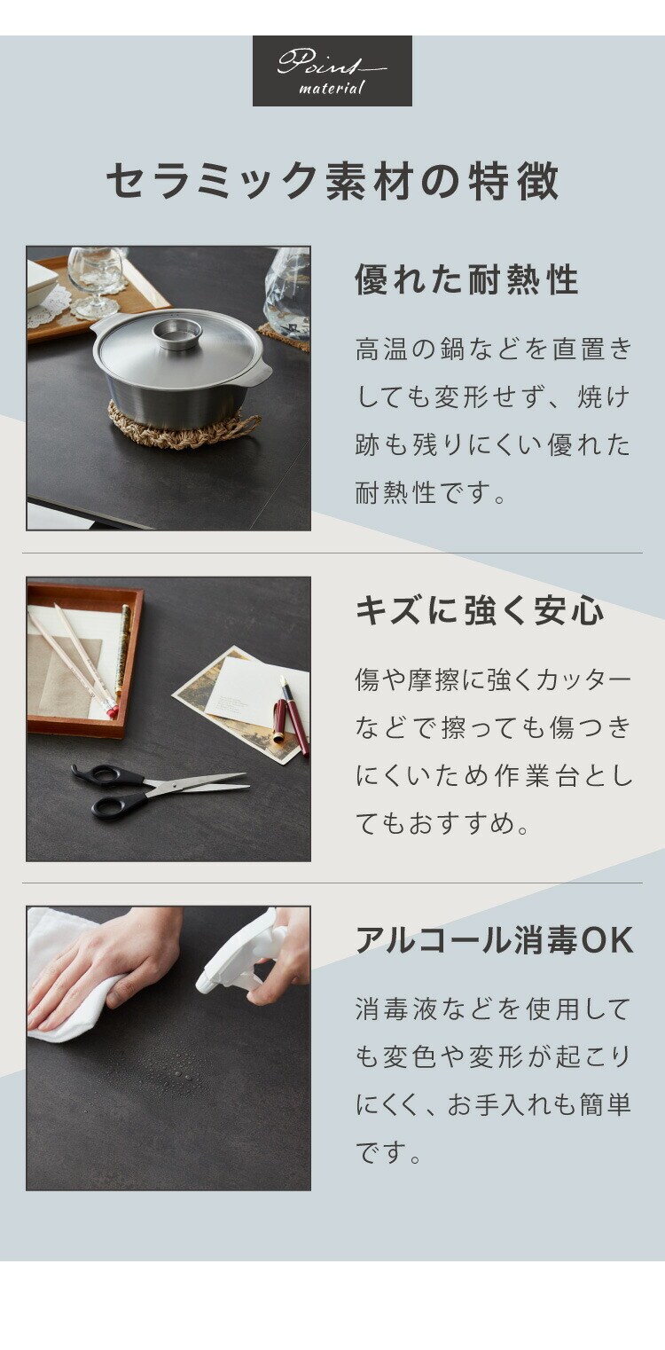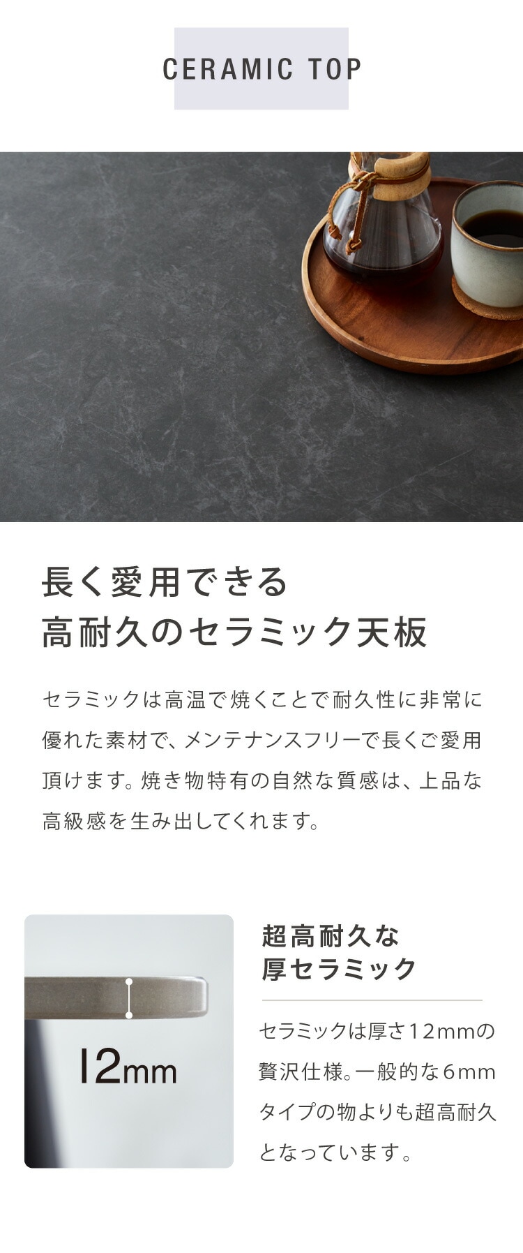 傷がつきにくく、熱に強い、厚さ12mmのセラミック天板。