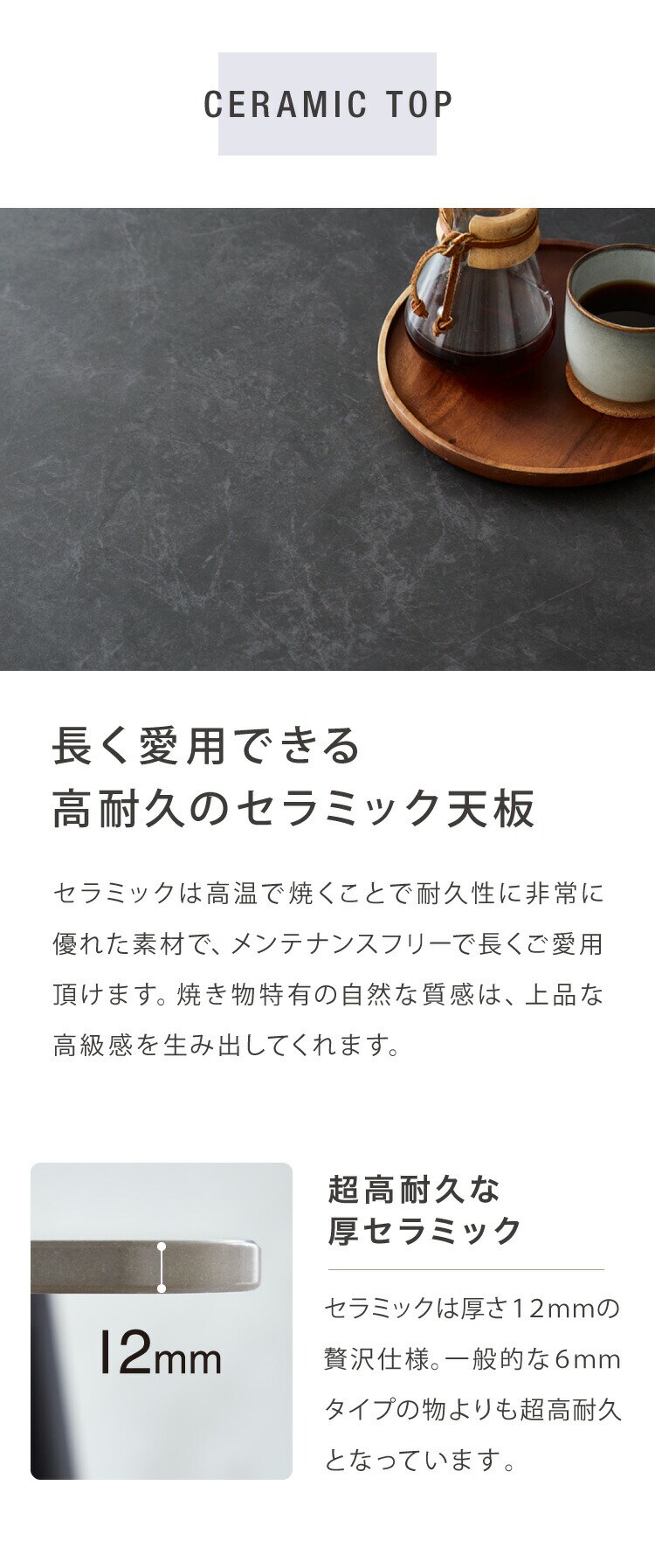 傷がつきにくく、熱に強い、厚さ12mmのセラミック天板。