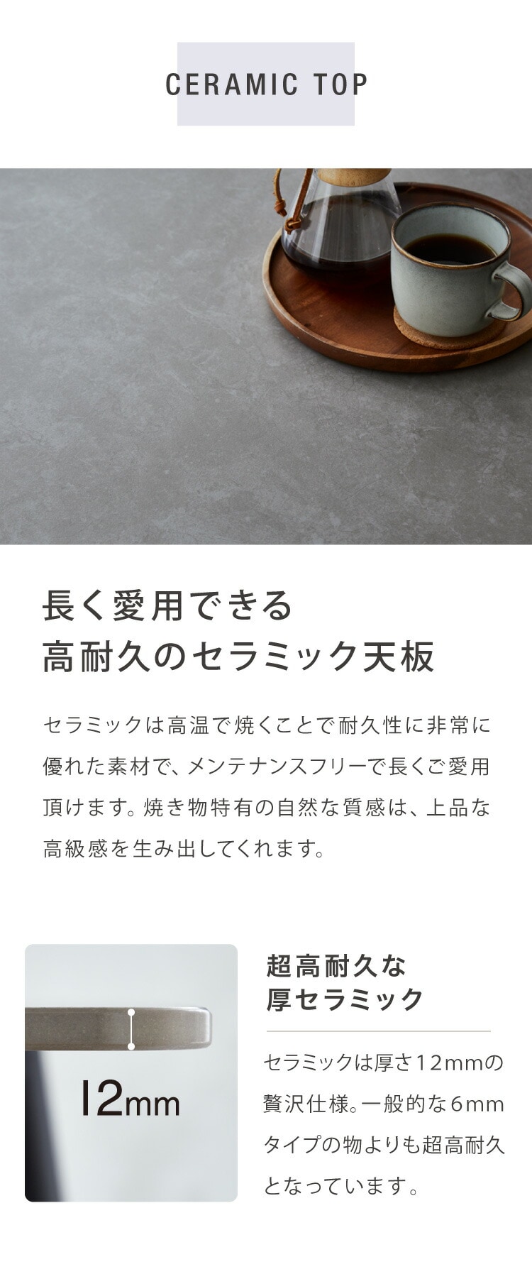 傷がつきにくく、熱に強い、厚さ12mmのセラミック天板。