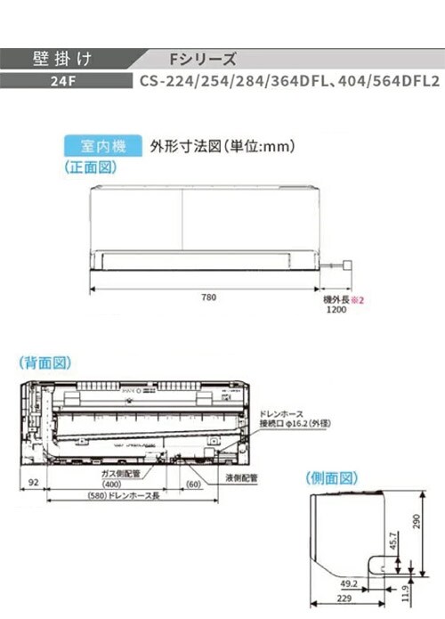 室内機寸法、重量 高さ290×幅780×奥行229mm、約8.5kg