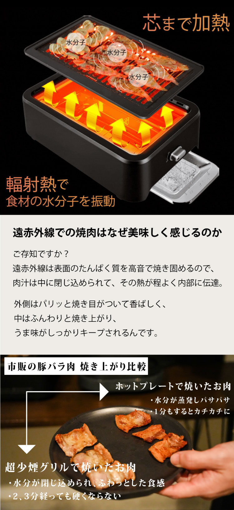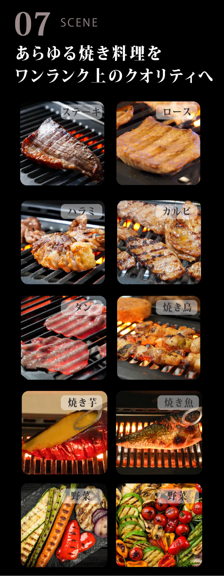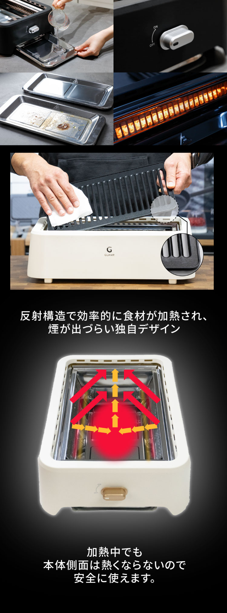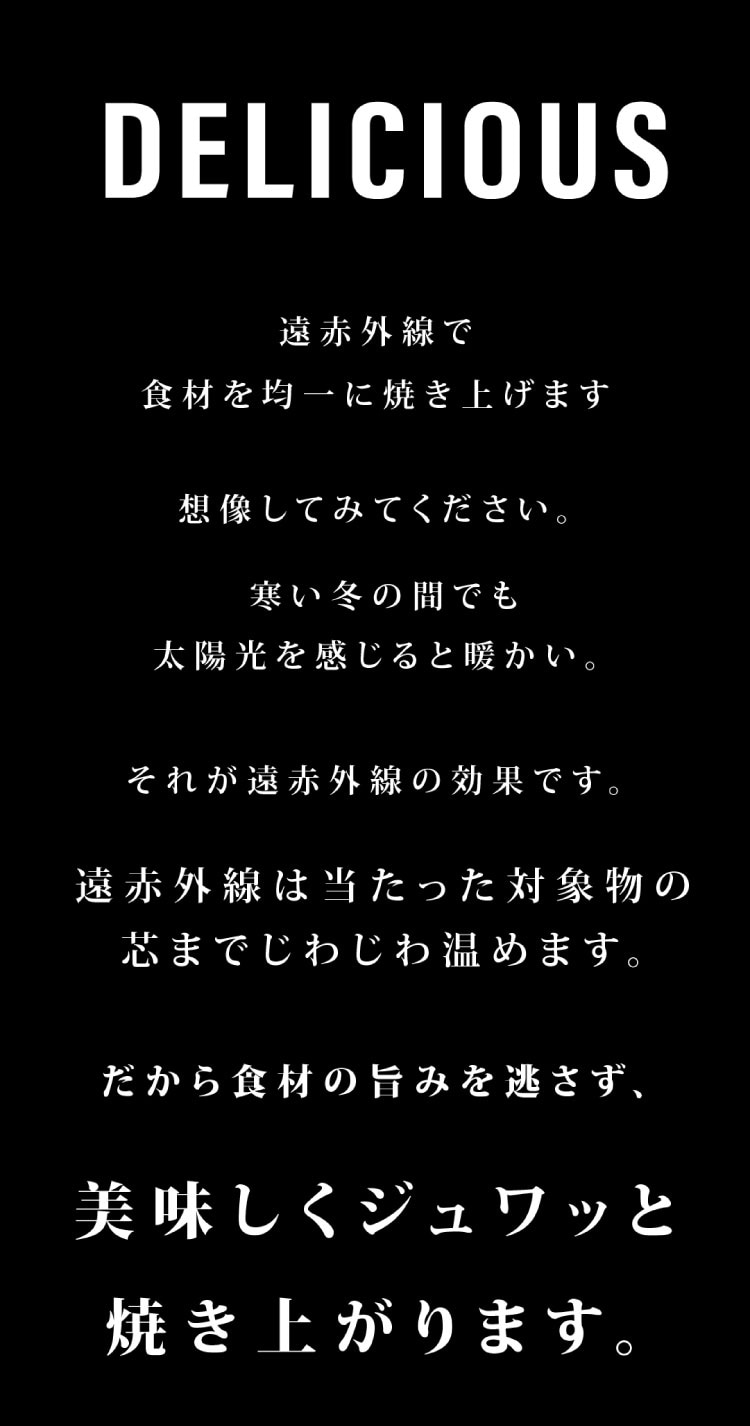 熱源回りもミラーフィニッシュのステンレスを使用しているのでサイドからの熱を食材に反射させ、ムラなくしっかりと焼けます。遠赤外線効果により、食材の芯までじんわりと焼けるので、まるで炭火焼きのように柔らく旨みを閉じ込めた美味しい焼き上がりになります。