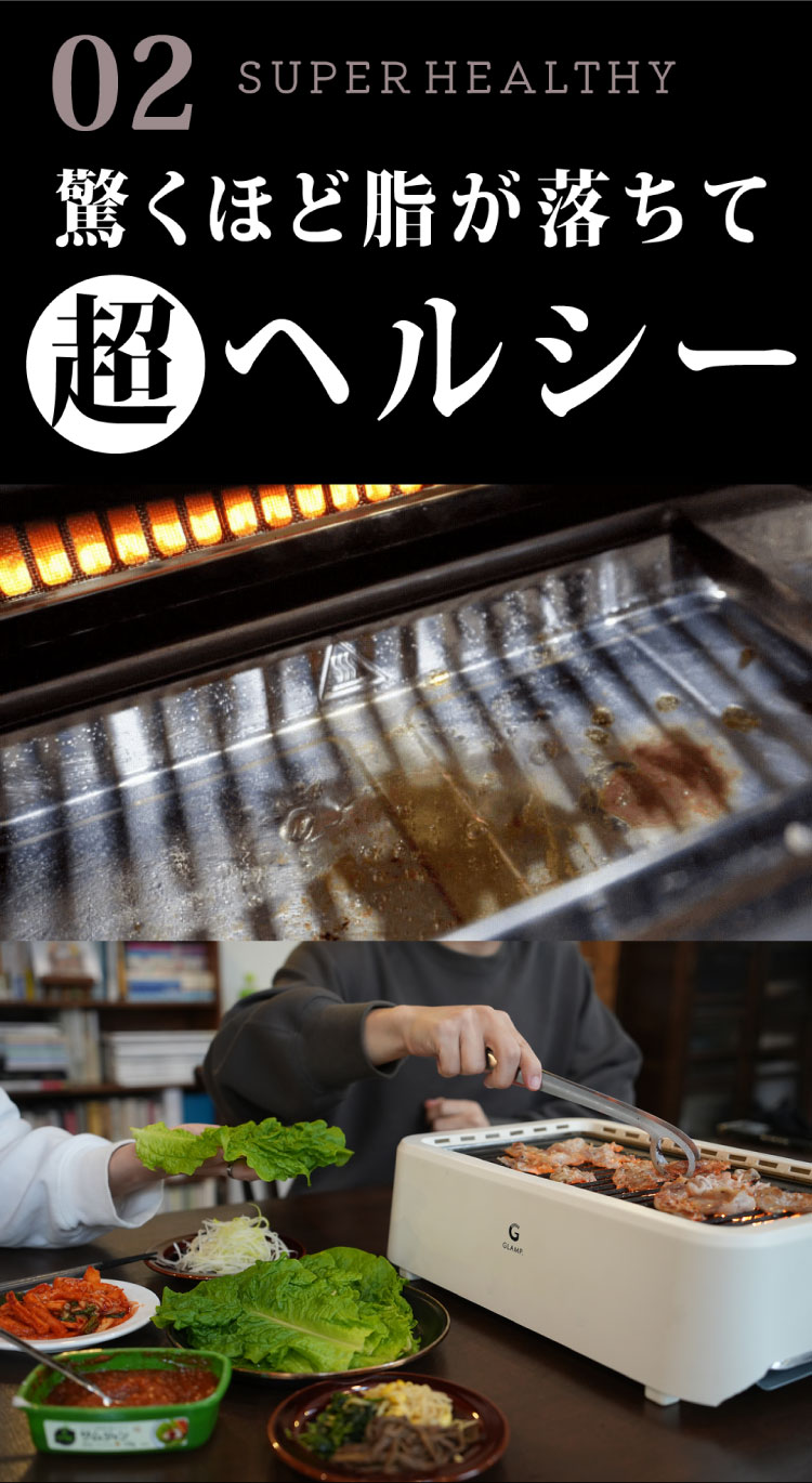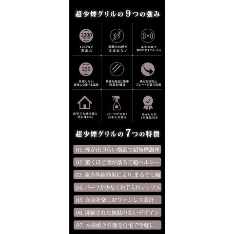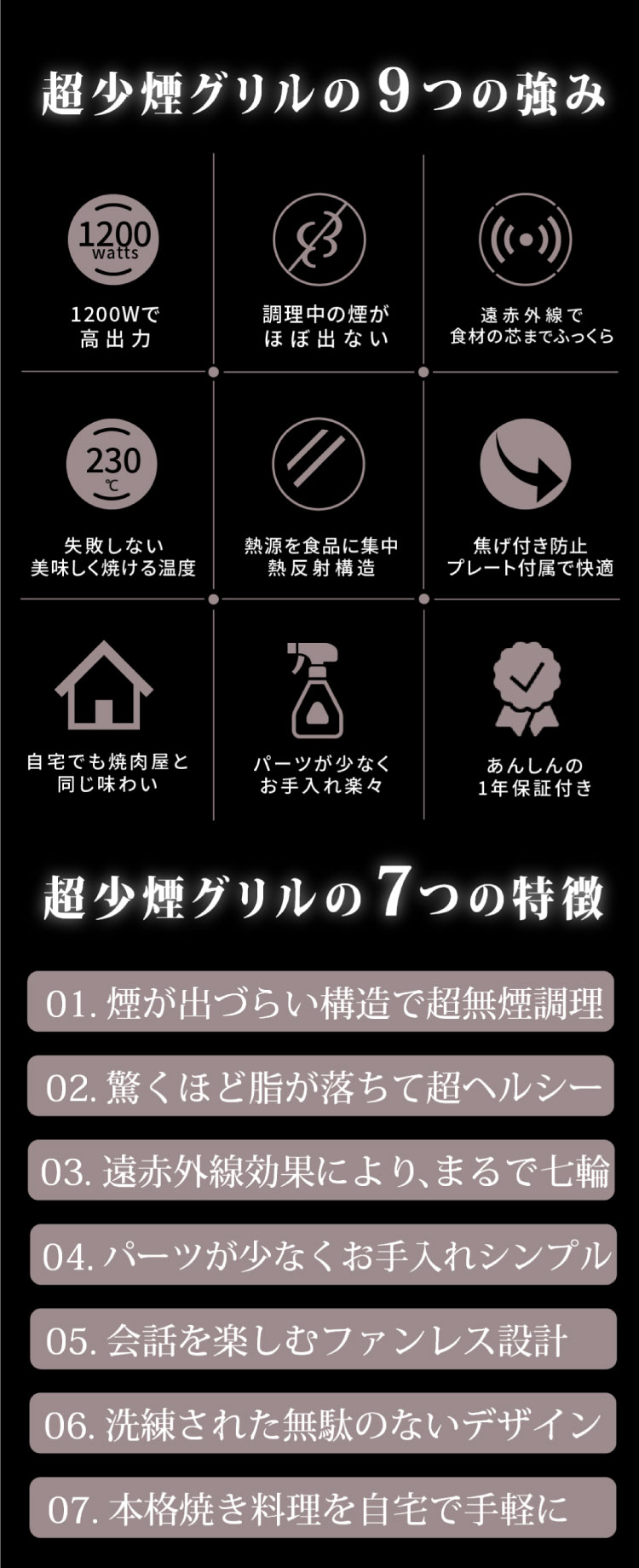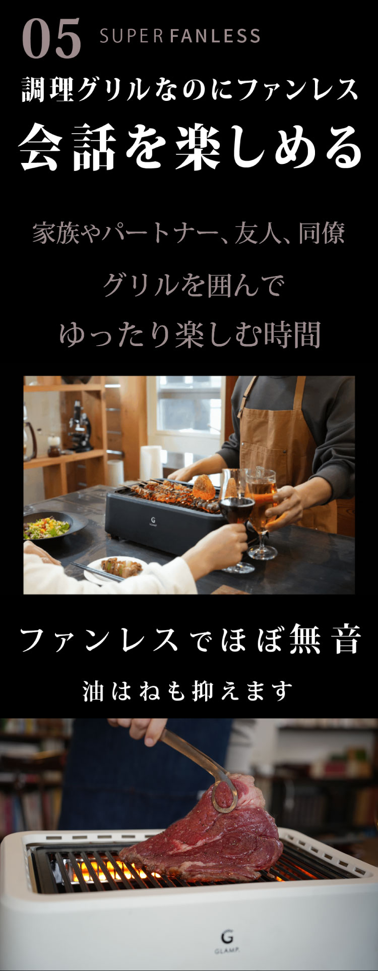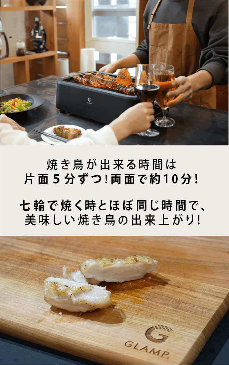 熱源回りもミラーフィニッシュのステンレスを使用しているのでサイドからの熱を食材に反射させ、ムラなくしっかりと焼けます。遠赤外線効果により、食材の芯までじんわりと焼けるので、まるで炭火焼きのように柔らく旨みを閉じ込めた美味しい焼き上がりになります。