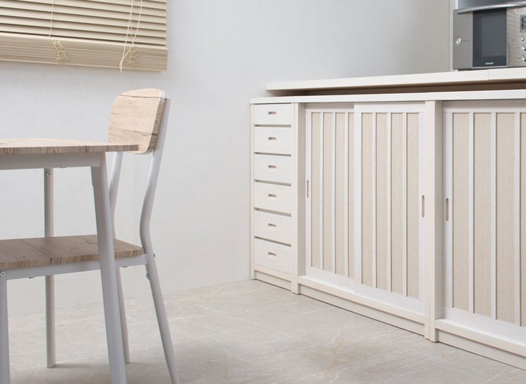 ■商品の仕様/前板:桐材(ウレタン樹脂塗装)、天板:強化プリント紙化粧繊維板、その他:プリント紙化粧繊維板