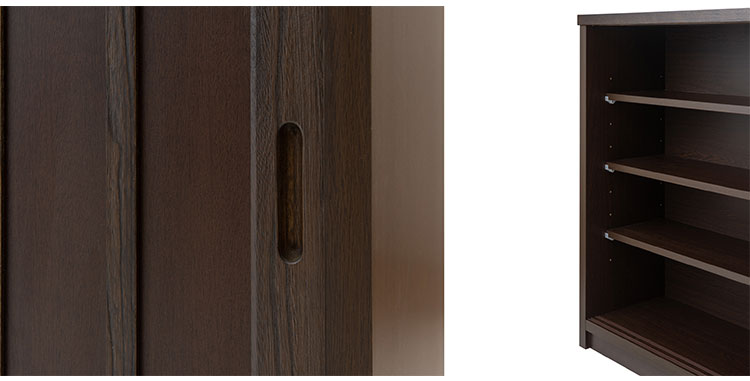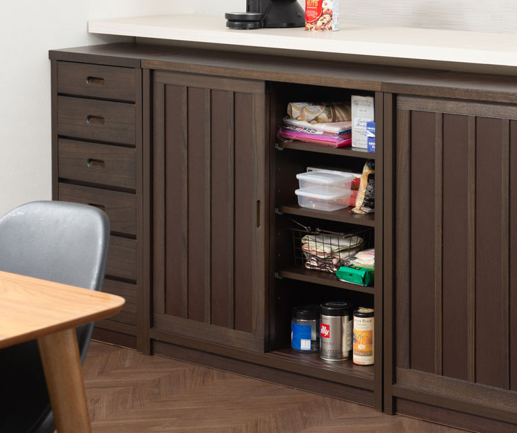 ■商品について/長く使える品質と高級感漂うデザインの【Tatis】シリーズが新登場!桐の木目を引き立たせたうづくり仕上げ、職人が組み上げた、日本製の完成品ならではの洗練されたデザインが魅力的なキッチンカウンター下収納シリーズです。和室はもちろん、洋室でも違和感なくお洒落なお部屋に演出してくれます♪2枚扉の引き戸式カウンター下収納は、すっきりとした仕上げがリビングに置いても飽きのこないデザインになっています。食器類の収納はもちろんの事、棚板の高さを変えて様々な物の収納ができます。カウンター下には案外収納する物が溢れています。CDやDVDを収納したり、アルバムや眼鏡ケースなど小物の収納にも便利です。また棚板を止める金具は特殊な金具を使い、設置すると落ちにくい構造になっています。カウンター下などデッドスペースに、造り付けのようなしっかりとした収納スペースが作れます。他のシリーズと合わせて、キッチンやリビングなどでお洒落に収納できます。