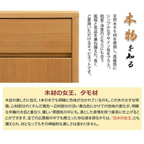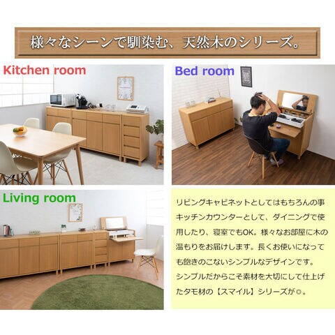【SMILE】スマイルシリーズ。天然木タモ材を使用し、高級感にシンプルなデザイン性をプラス。和室・洋室のどちらにも合う風格と気品を兼ね備えた、キャビネットシリーズです。