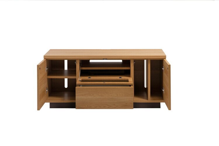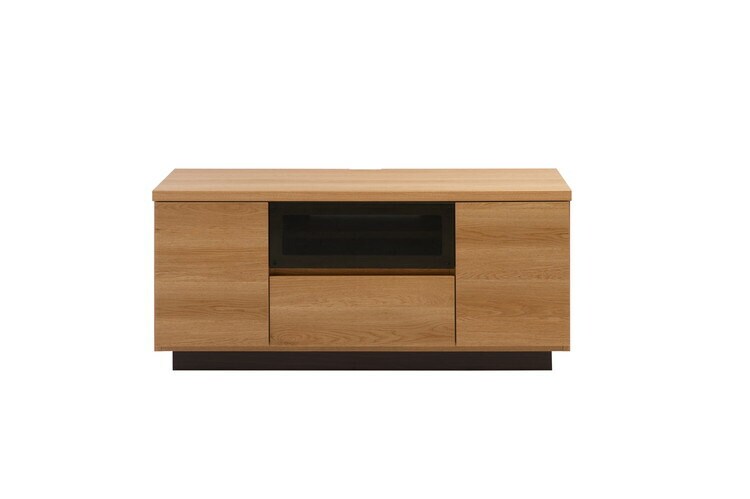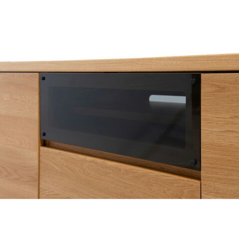 フラップ式扉はスモークガラスが前面に張られ、マットな美しい木目の本体にガラスの鏡面感が際立ちます。