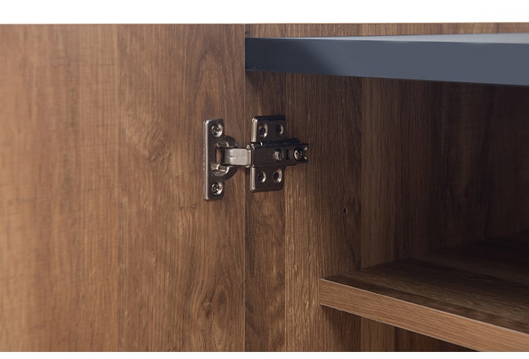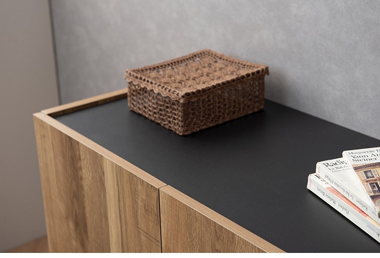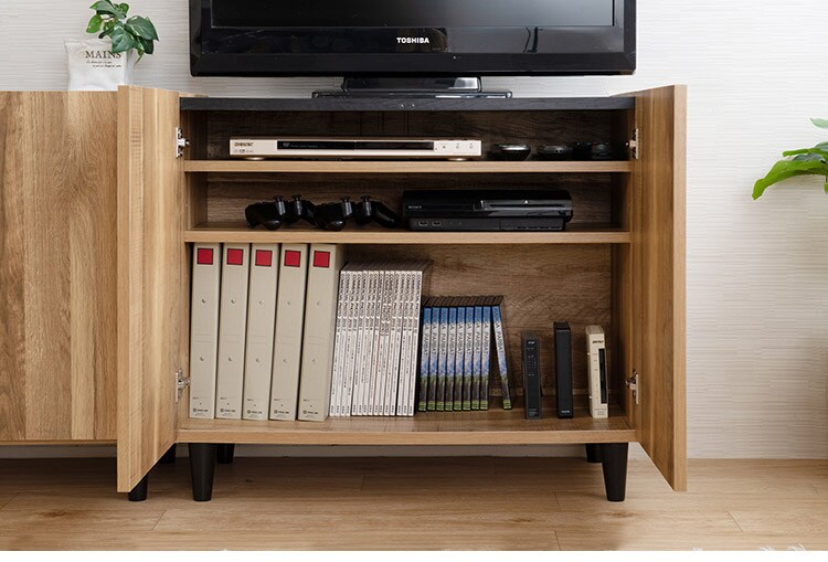 工業的な雰囲気が漂うカフェやアパートメントなどをイメージとした素朴な雰囲気を醸し出したお洒落なブルックリンスタイルのキャビネットシリーズ。マットなシートを使用し、よりリアルに天然木の仕上げに近づけています。扉の中は、収納物に合わせて高さを変えることができる棚板が2枚付いており、書類や趣味の物はもちろんの事、配線ができるようにコード穴とそれぞれの棚板の後ろは1cmの隙間を設けて、ルーターやデッキを収納しても、配線ができるので大変便利な仕様になっています。
