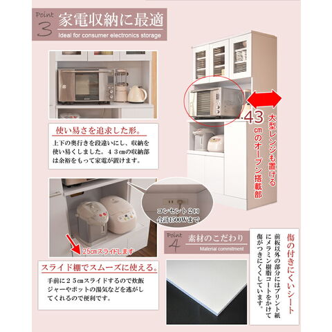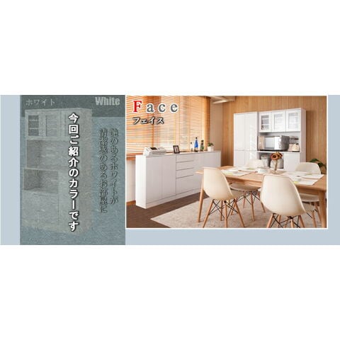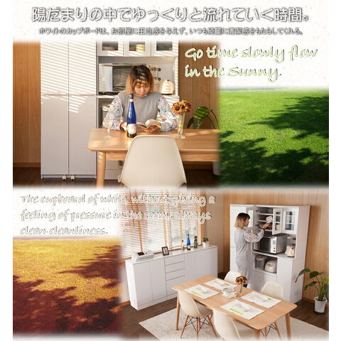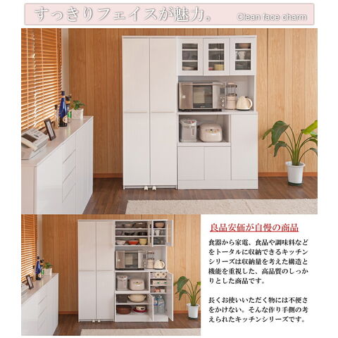 ■商品について/艶のあるすっきりフェイスのカップボード。収納量と品質にもこだわり、棚板の枚数も通常の類似商品と違い上部・下部とも増量。棚板を支えるダボにはネジダボを採用。通常の差し込みのダボでは穴がきつく、一度はめると取れにくくなったり、スポッと取れて棚板が落ちる事が多々あります。ネジ式ダボはそんなストレスも解消!しっかり設置して位置変えも簡単です。
