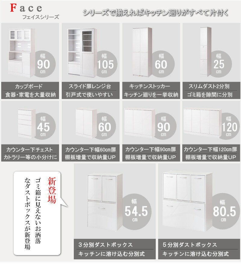■商品の仕様/天・前板:ハイグロス化粧繊維板、その他:プリント紙化粧繊維板(傷に強い樹脂コート加工)