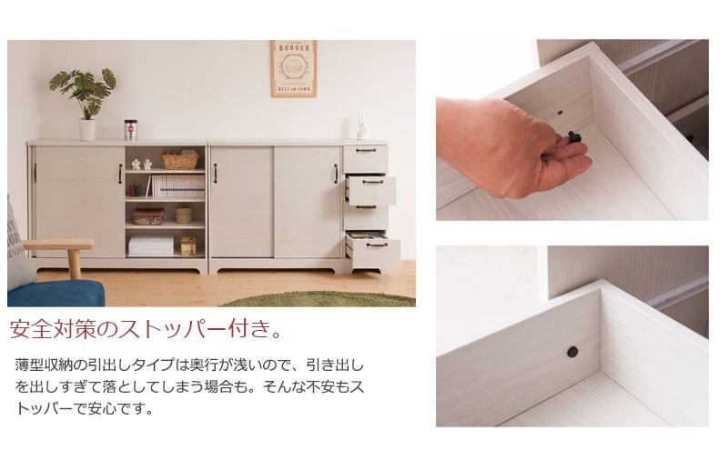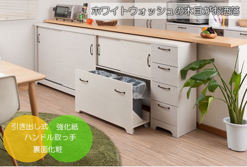 カウンター下やリビングなど様々なシーンで活躍する薄型キャビネットは幅90、120にダストボックスまで取りそろえ、インテリア度アップ。