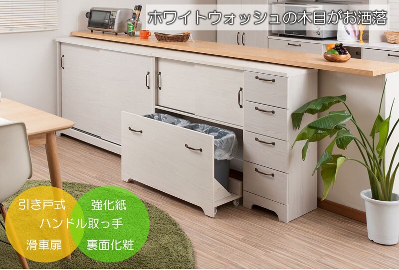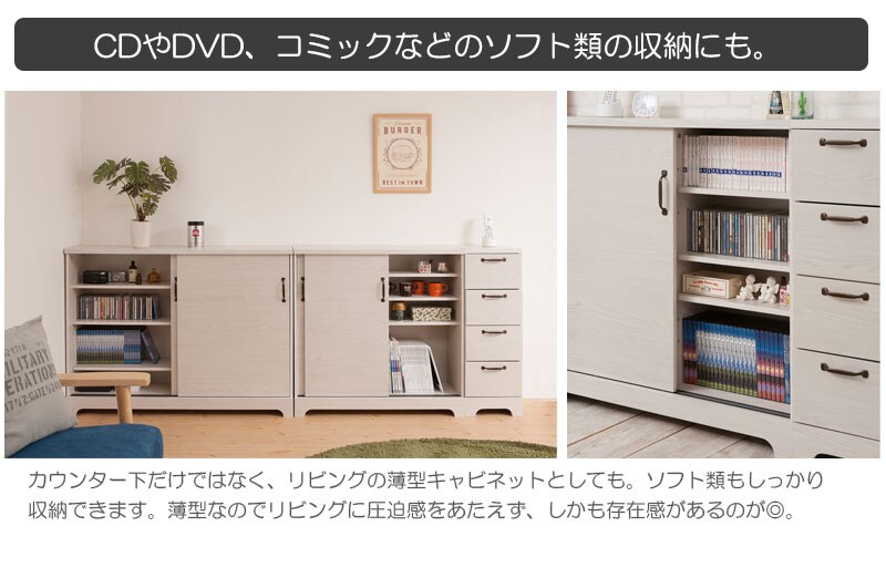カウンター下やリビングなど様々なシーンで活躍する薄型キャビネットは幅90、120にダストボックスまで取りそろえ、インテリア度アップ。