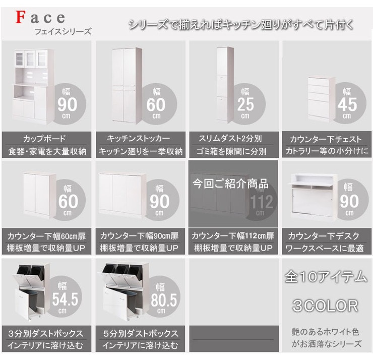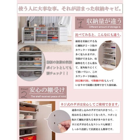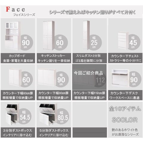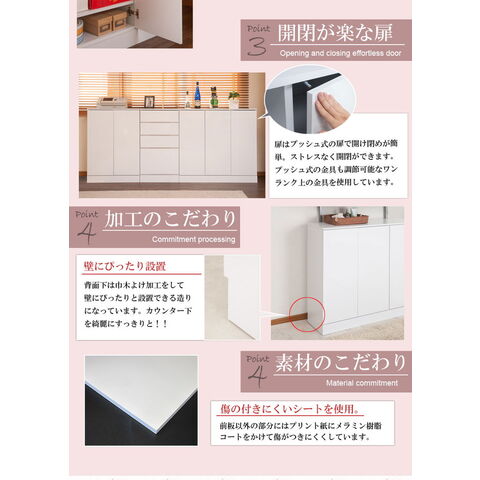 引出しタイプと幅の3種類ある扉タイプでカウンター下のスペースと収納物に合わせてお選び頂けます。■商品の仕様/前板・天板:ハイグロス化粧繊維板、その他:プリント紙化粧繊維板(傷に強い樹脂コート加工)