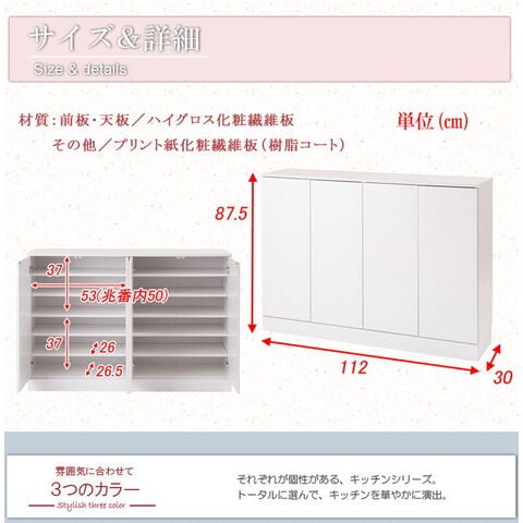 ■商品サイズ/本体:(約)幅112×奥行30×高さ87.5cm、扉内寸:左右扉内共通(約)幅53(兆番内50)×奥行26×高さ37(固定棚挟み上下共通)cm