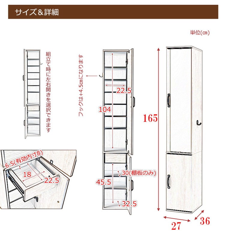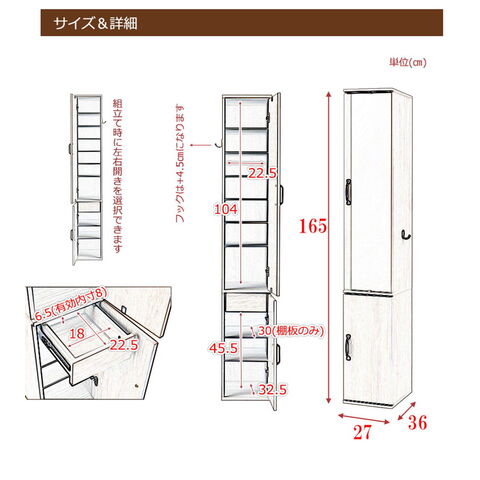扉内寸:(約)幅22.5×奥行32.5(可動棚奥行30)×高さ(上)104(下)45.5cm