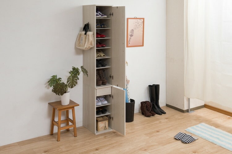 ミラー付きで内部に引出しも付いた機能的シューズラック。