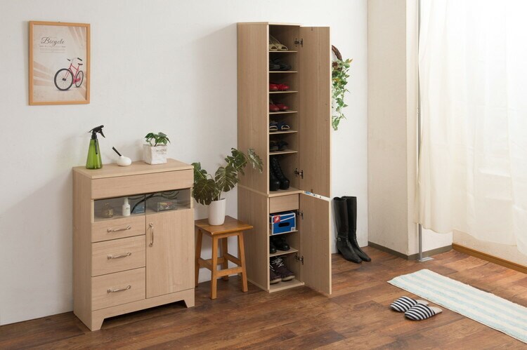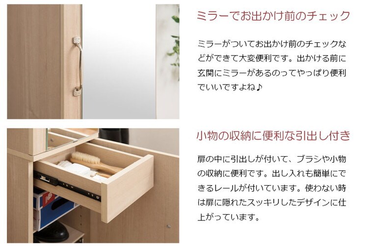 ミラー付きで内部に引出しも付いた機能的シューズラック。