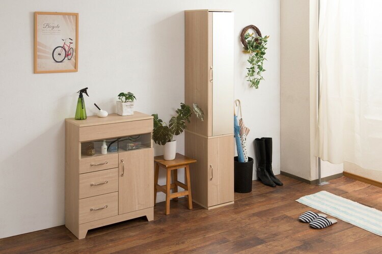全身ミラー付きですっきりとしたデザインはリビングや寝室など衣類収納としてもOK。